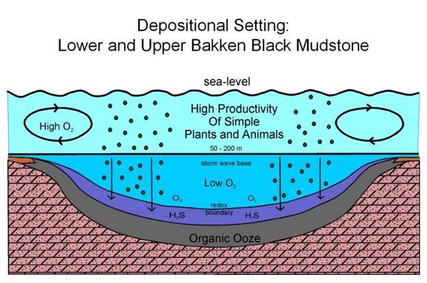 Fig. 8. Deposition setting of upper and lower Bakken shales under anoxic conditions (modified from Smith and Bustin, 1996; Meissner et al., 1984).
