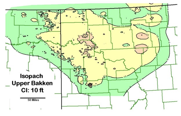 Fig. 10. Isopach map of upper Bakken shale. Thickness ranges from a zero edge to over 20 ft.