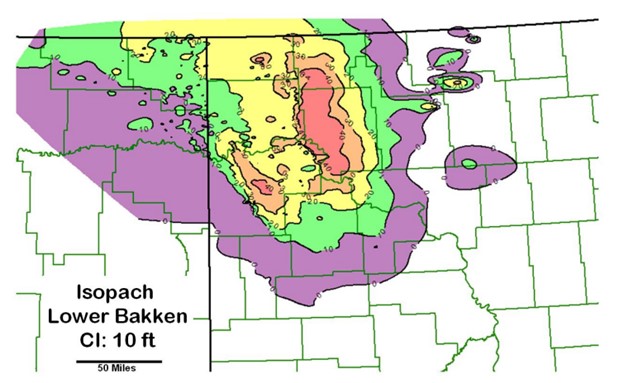 Fig. 9. Isopach map of lower Bakken shale. Thickest area is east of the Nesson anticline and generally coincides with the Parshall area.