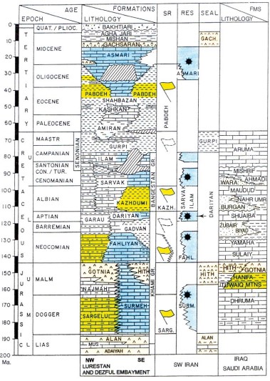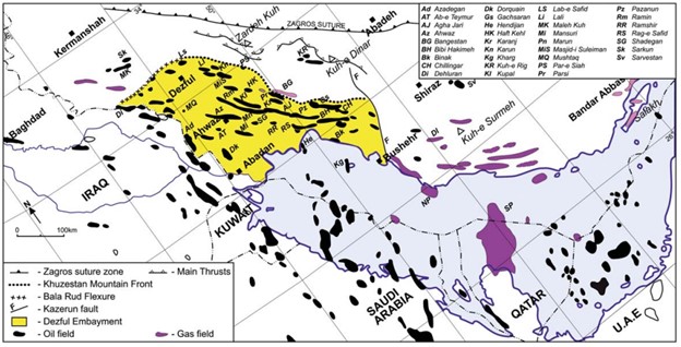 Source of information: Current distribution of oil and gas fields in the Zagros Fold Belt of Iran and contiguous offshore as the result of the petroleum systems. M. L. Bordenave, J. A.Hegre. 2014