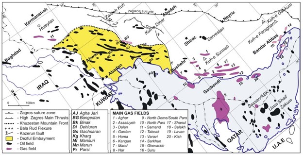 In the current Zagros Fold Belt of Iran and in its contiguous offshore, five petroleum systems caused an impressive gathering of oil and gas fields that represent some 8% and 15% of global oil and gas reserves, respectively. Almost all the oil fields are located in the relatively small Dezful Embayment, which extends over 60 000 km2, whereas most of the gas fields are concentrated in Central and Coastal Fars and in the contiguous offshore area.