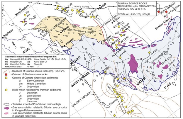 The Palaeozoic Petroleum System formed by Llandovery source rocks and Dalan and Kangan carbonate reservoirs is sealed by the thick massive anhydrite of the Dashtak Formation. As the result of the north–south residual high that extended between Central Fars and the Qatar Arch before the Llandovery transgression, and the Hercynian uplift followed by intense erosion, Llandovery source rocks are confined in two basins, one extending from Oman to Abu Dhabi and to the north of Bandar Abbas, and another including Saudi Arabia, west of Qatar, Iraq, Jordan, and most probably the Dezful Embayment. The Palaeozoic System does not generally interfere with younger petroleum systems, at least in areas where the Dashtak evaporites are well developed. In contrast, in the Bandar Abbas coastal area, gas probably of Llandovery origin found its way upward to younger reservoirs.