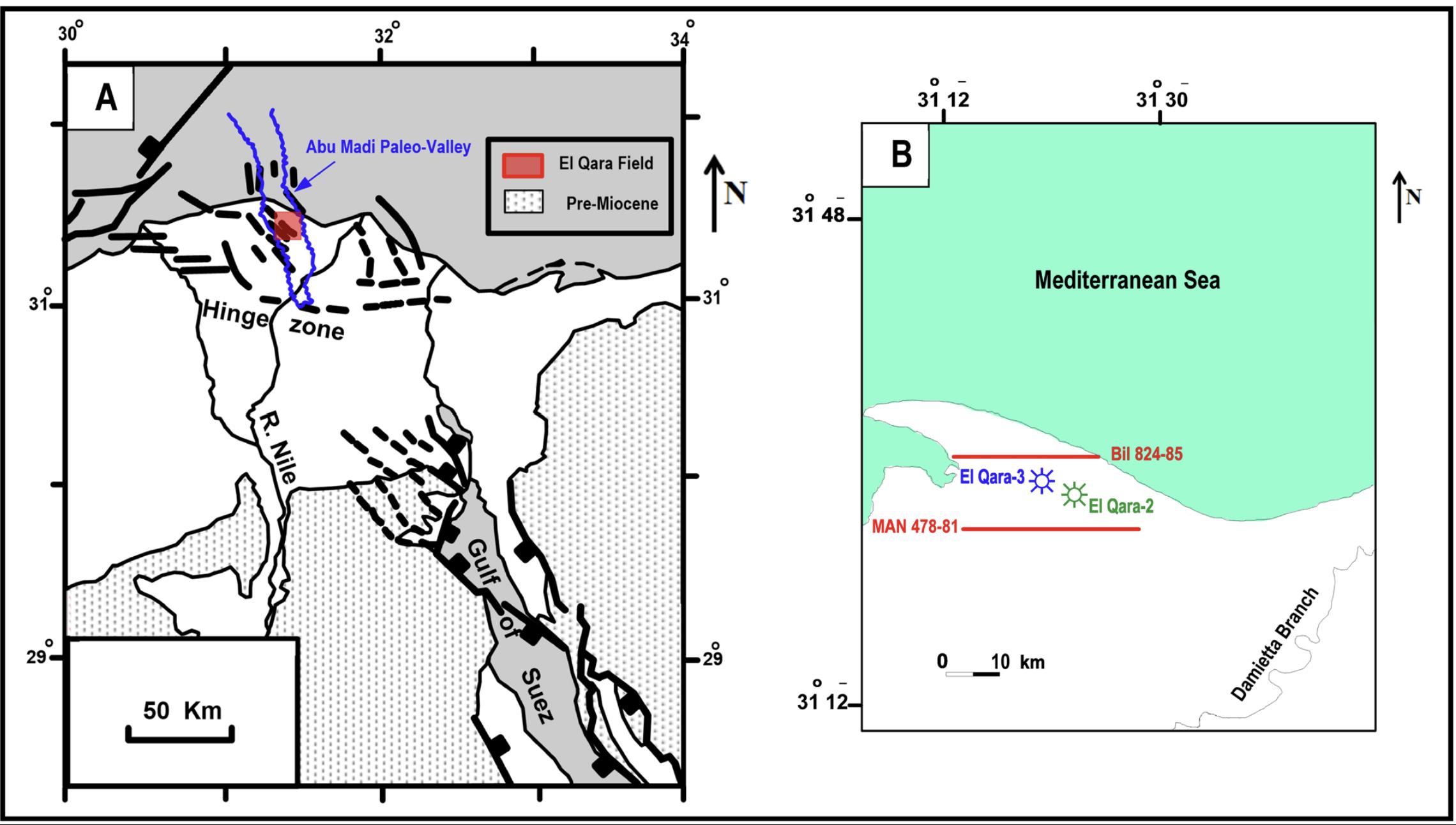 El-Qara Field lies within the Abu Madi Paleovalley to the north of NDB close to the Egyptian Coast (Fig. 1). It contains several drilled wells that produce gas from the sandstones of Abu Madi Fm. In this study, two wells in El-Qara Field were examined, namely, El-Qara-2 and ElQara-3. El-Qara-2 well was drilled with a total measured depth of 3460 m at the intersection between latitude 31° 28′ 57.1640″ N and longitude 31° 18′ 40.8516″ E. Alternatively, El-Qara-3 well has a total measured depth of 3505 m at the point between latitude 31°29′ 34.91″ N and longitude 31°16′ 54.641″E (Fig. 1)