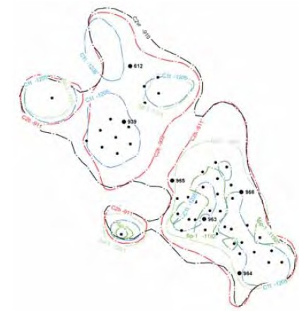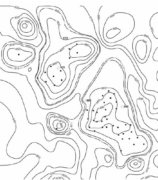 Выявлено и введено в разработку 13 залежей нефти, контролируемых 2 поднятиями (рис. 1, 2). Все продуктивные отложения в разрезе месторождения отличаются неоднородностью по площади и разрезу (табл. 1). Залежи нефти в отложениях турнейского яруса осложнены врезами.