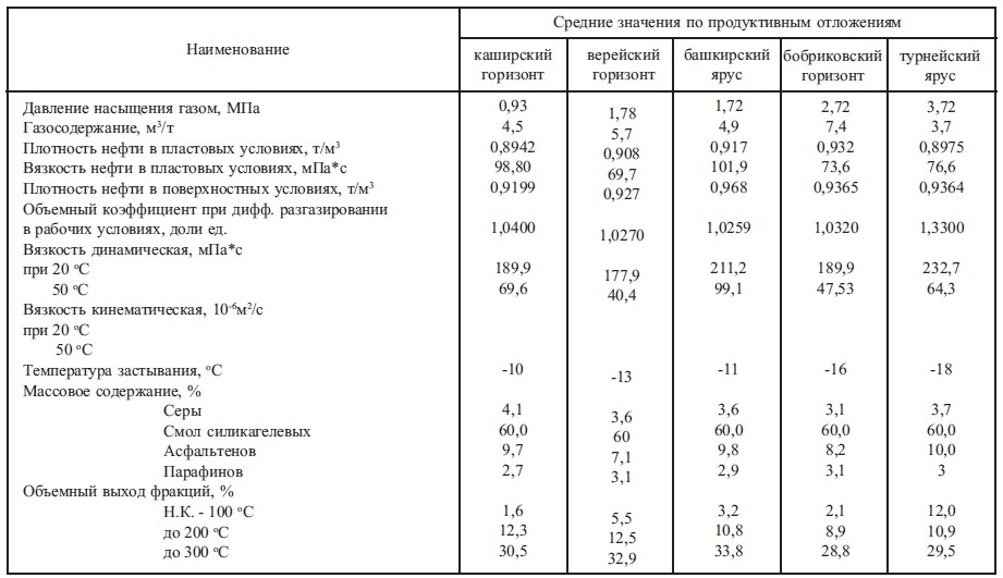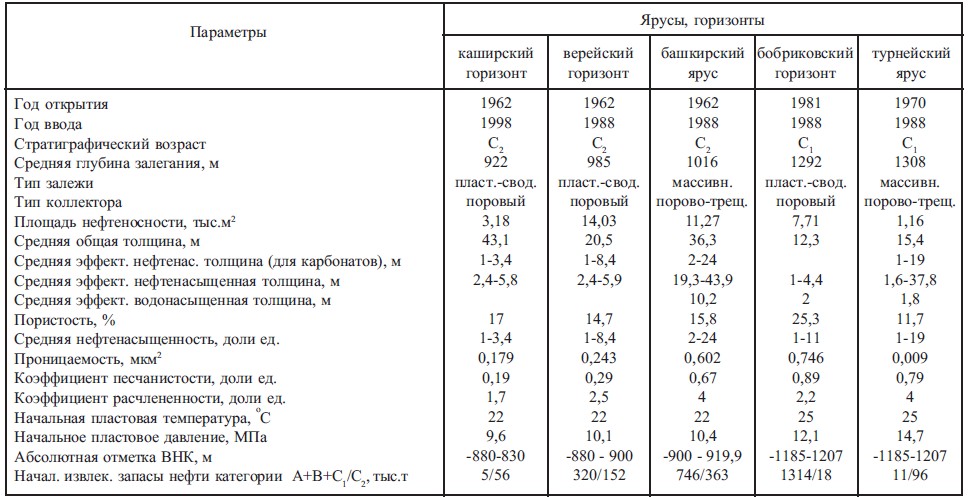 Коллекторы отложений бобриковского горизонта сложены песчано-алевролитовыми породами, башкирского, верейского возрастов – преимущественно известняками нескольких структурно-генетических разностей с прослоями доломитов, характеризующихся микро- и макротрещиноватостью хаотичного и субгоризонтального направления, которая является основной флюидопроводящей системой (табл. 2.1). Нефти месторождения по результатам исследований пластовых и поверхностных проб можно отнести к тяжелым, сернистым, парафинистым и высоковязким (табл. 2.2). Характеристика попутного газа, добываемого с нефтью, приведена в таблице 2.3. Запасы нефти утверждены в ГКЗ РФ (табл. 2.1). 47 % запасов от НИЗ категории С1 сосредоточены в карбонатных коллекторах.