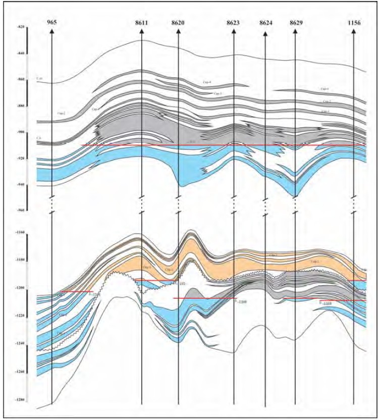 Рис.3. Аделяковское месторождение. Геологический профиль по продуктивным отложениям карбона