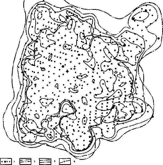 Рис. 1. Аганское нефтяное месторождение. Сема расположения скважин (I) пласта БВ8: 2 — внешний и внутренний контуры нефтеносности, утвержденные ГКЗ; 3 — уточненные контуры нефтеносности; 4 — изогипсы пласта БВ8