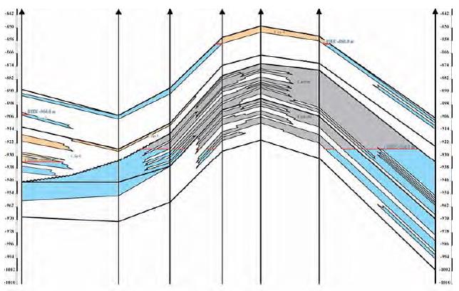 Рис.1. Аксаринское месторождение. Схематический геологический профиль продуктивных отложений нижнего карбона.