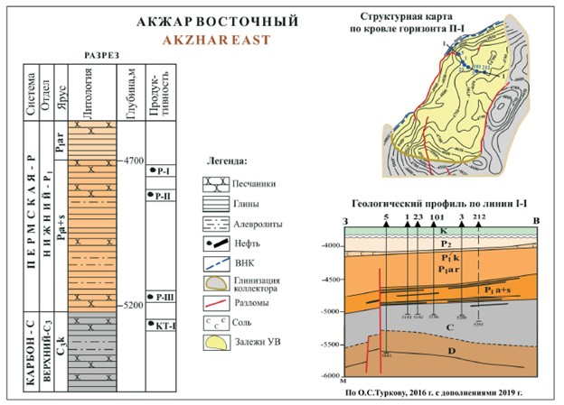 Продуктивные горизонты выявлены в позднекаменноугольных (КТ-1) и раннепермских отложениях (Р-1, Р-11 и Р-111), залегают на глубинах 4700- 5300 м , моноклинально погружаются к центру впадины, имеют тектоническое и литологическое ограничения.