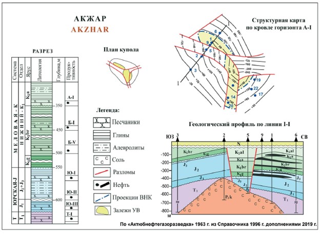 Нефтяное месторождение Акжар расположено в центральной зоне Восточно-Прикаспийской НГО, в 60 км юго-западнее известного месторождения Кенкияк. В структурном отношении месторождение приурочено к трехкрылому соляному куполу с глубиной соляного штока около 450 м. Продуктивность установлена на северном и юго-восточном крыльях купола, где в отложениях нижнего триаса (Т-I), нижней (Ю-III), средней юры (Ю-I и Ю-II), баррема (Б-I-V) и апта (А-I) установлены нефтяные горизонты. Небольшие нижнемеловые горизонты установлены в грабене.