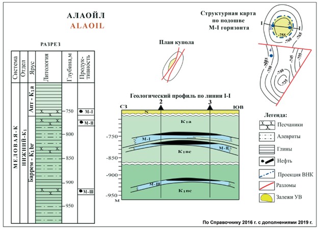 Продуктивность месторождения связана с нижнемеловыми отложениями, в которых разведаны три нефтяных горизонта. В базальных песчаниках апта