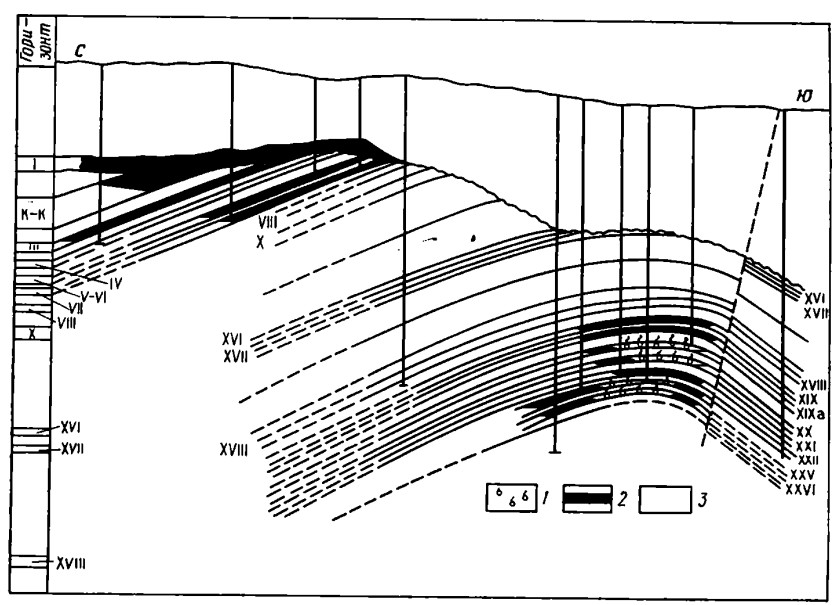Рис.1. Геологический профиль месторождения Южный Аламышик. По Т. Таджиеву, 1972 г. 1- газ; 2 - нефть; 3 - непроницаемые породы
