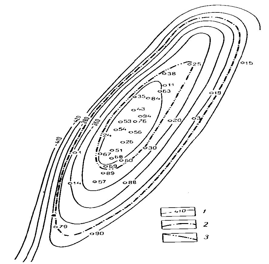 1 – изогипсы продуктивного пласта, 2 – контур газоносности IV пласта, 3 – контур газоносности V пласта.
