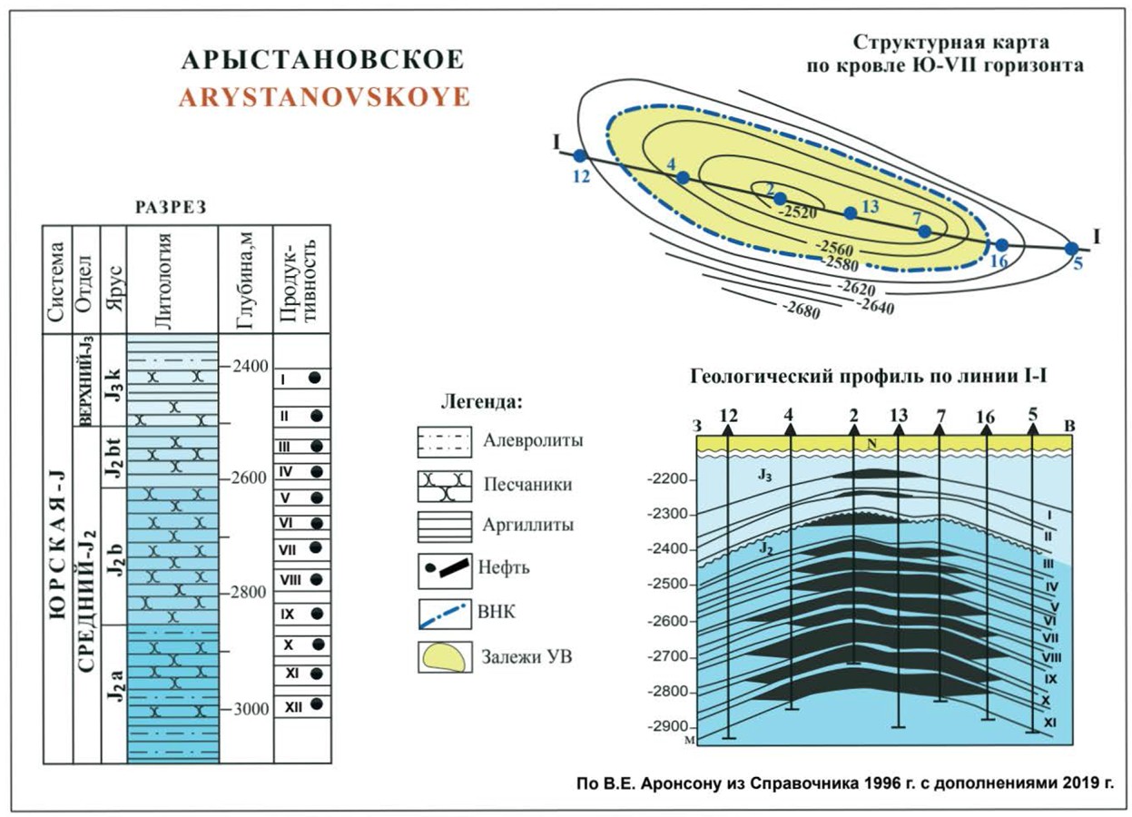 В продуктивном разрезе выделяются 12 нефтяных горизонтов. Два верхних горизонта разведаны в келловейских отложениях, остальные равномерно распределены по всему среднеюрскому разрезу. Эффективные нефтенасыщенные толщины продуктивных горизонтов колеблются от 3,8 до 12,7 м. Залежи пластовые сводовые, в ряде случаев литологически экранированные.