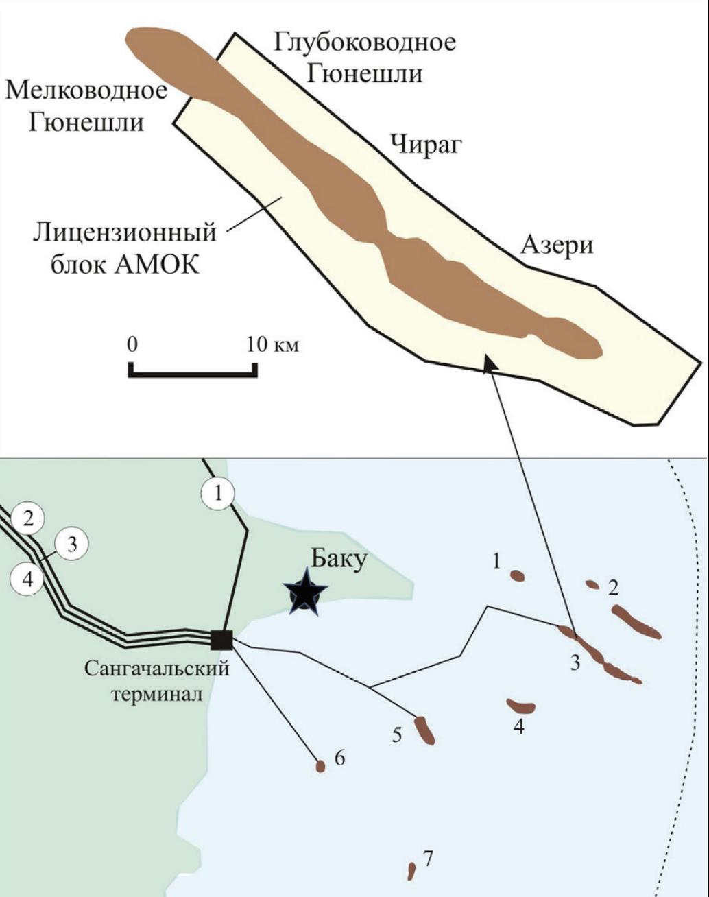 В 1981–1987 гг. в акватории Каспия к востоку от Апшеронского полуострова открыты три месторождения нефти – Азери, Чираг и Гюнешли (рис. 1). В 1994 г. подписано соглашение (на основе СРП) по их разработке (проект «АЧГ») между консорциумом (Азербайджанская Международная Операционная Компания – АМОК) и Азербайджаном. Консорциум (по состоянию на 01.01.2014 г.): английская «BP» (оператор, 35,8 %), американская «Chevron» (1,3 %), японская «Inpex» (11,0 %), японская «Itochu» (4,3%), американская «Exxon Mobil» (8,0 %), индийская «ONGC Videsh Ltd» (2,7 %), Госнефтекомпания Азербайджана «ГНКАР» (1,6 %), норвежская «Statoil» (8,6%) и турецкая «TPAO» (6,8%). Соглашение получило неофициальное название «Контракт века» и будет действовать до 2024 г.