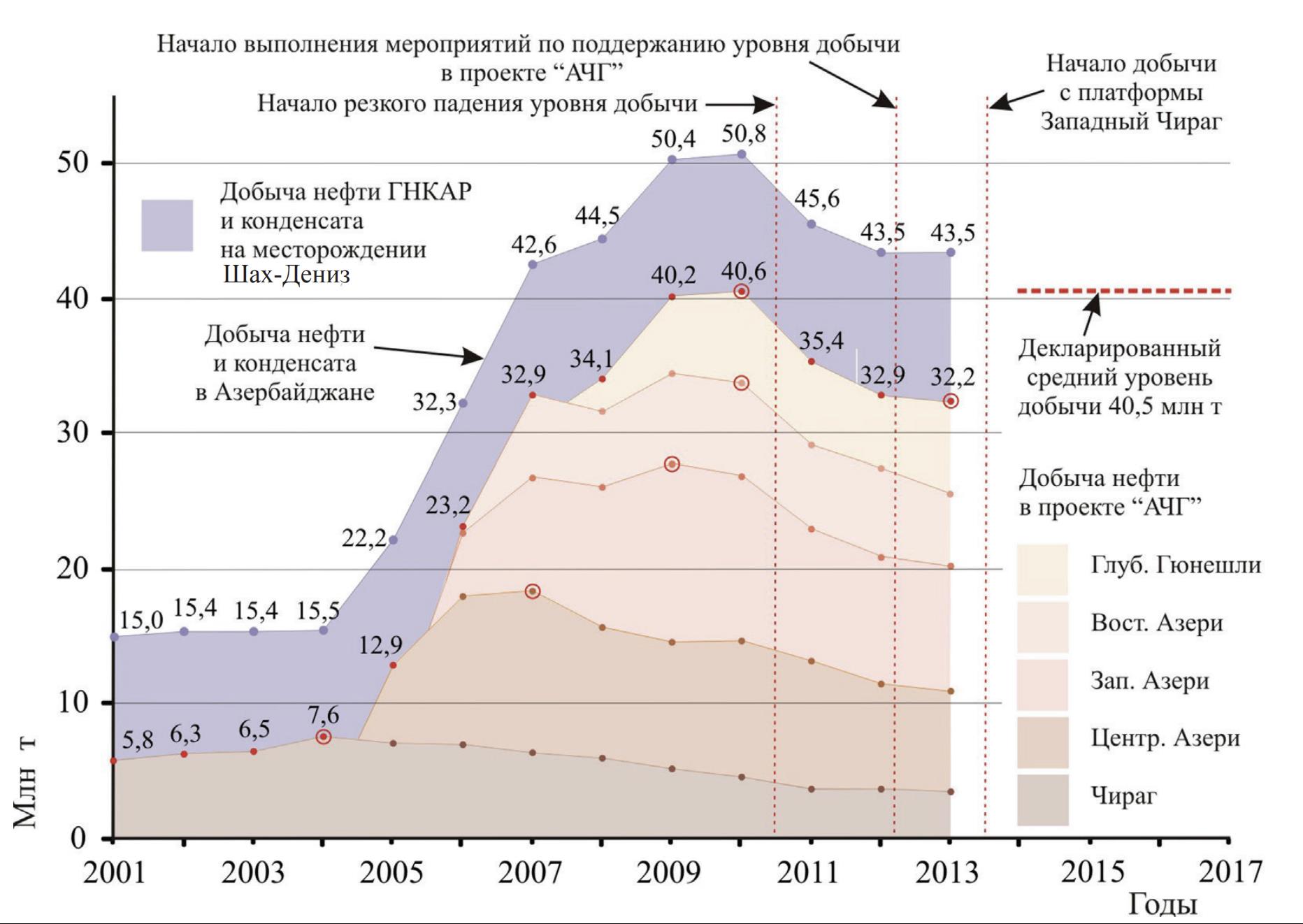 К концу 2012 года между Азербайджаном и АМОК были достигнуты соглашения относительно мероприятий по стабилизации добычи нефти на блоке «АЧГ». Они включали бурение новых эксплуатационных скважин в проекте «АЧГ» и строительство платформы Западный Чираг. По проекту «АЧГ» в период 2007–2013 гг. добыто 75–80 % всей нефти Азербайджана. А 65 % от общего объема добычи нефти ГНКАР приходится на Мелководную Гюнешли. Всего мегапроект Азери-ЧирагГюнешли дает 91–93% нефти Азербайджана, и речь идет о стабилизации ее добычи в республике.