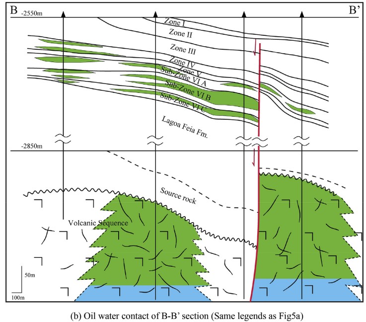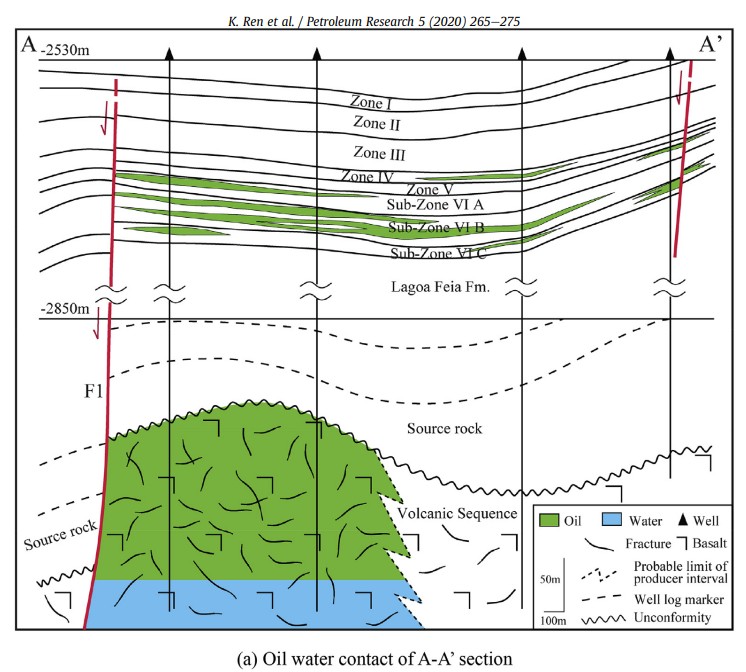 The underlying fractured basalts of the Badejo oilfield are nonconventional reservoirs. It is tholeiitic, vesicular and locally breccoidal. The vesicules are dominantly filled with zeolite. The development of natural fractures helps to remove the filled zeolite by secondary solution and to generate additional vugular pore spaces. Although the fractures are common in the Badejo field basalts, most of them frequently are filled by calcites. Locally they are found open and thus the excellent reservoirs are developed (Tigre et al., 1983). It reveal that rock facies such as vitreous basalt and breccia frequently develop better reservoir quality with megafractures than other types (Guardado et al., 1989). Some reservoir potentiality of the fractured basaltic rocks have porosity similar to pre-salt carbonate reservoirs ranges (10%-15%) in the hydrocarbon bearing intervals (Ma et al., 2011; Vieira de Luca et al., 2015). However, due to strong heterogeneity and poor continuity of fractures, commercial oil are accumulated mainly in places with high fractures and strong secondary dissolution, and often failure wells are drilled around high-yield wells (Fig. 1).