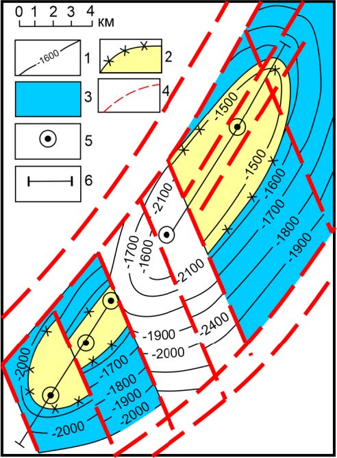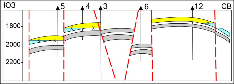 Степень заполнения выявленной и предлагаемых залежей на месторождении контролируется зоной дробления и плоскостью сместителя сброса. Сжатие со стороны Таймырского складчатого сооружения определило наклон сбросов (сбросо-сдвигов) в южном направлении. Сбросы наследуют по простиранию выходящих на размытую поверхность доюрских отложений надвигов и взбросов. Сбросы таким образом становятся реверсными нарушениями с обратным знаком движения. Поперечные разрывные нарушения являютсясубвертикальными и не сопровождаются зоной дробления пород, а плоскость сместителя является в таком случае тектоническим экраном.