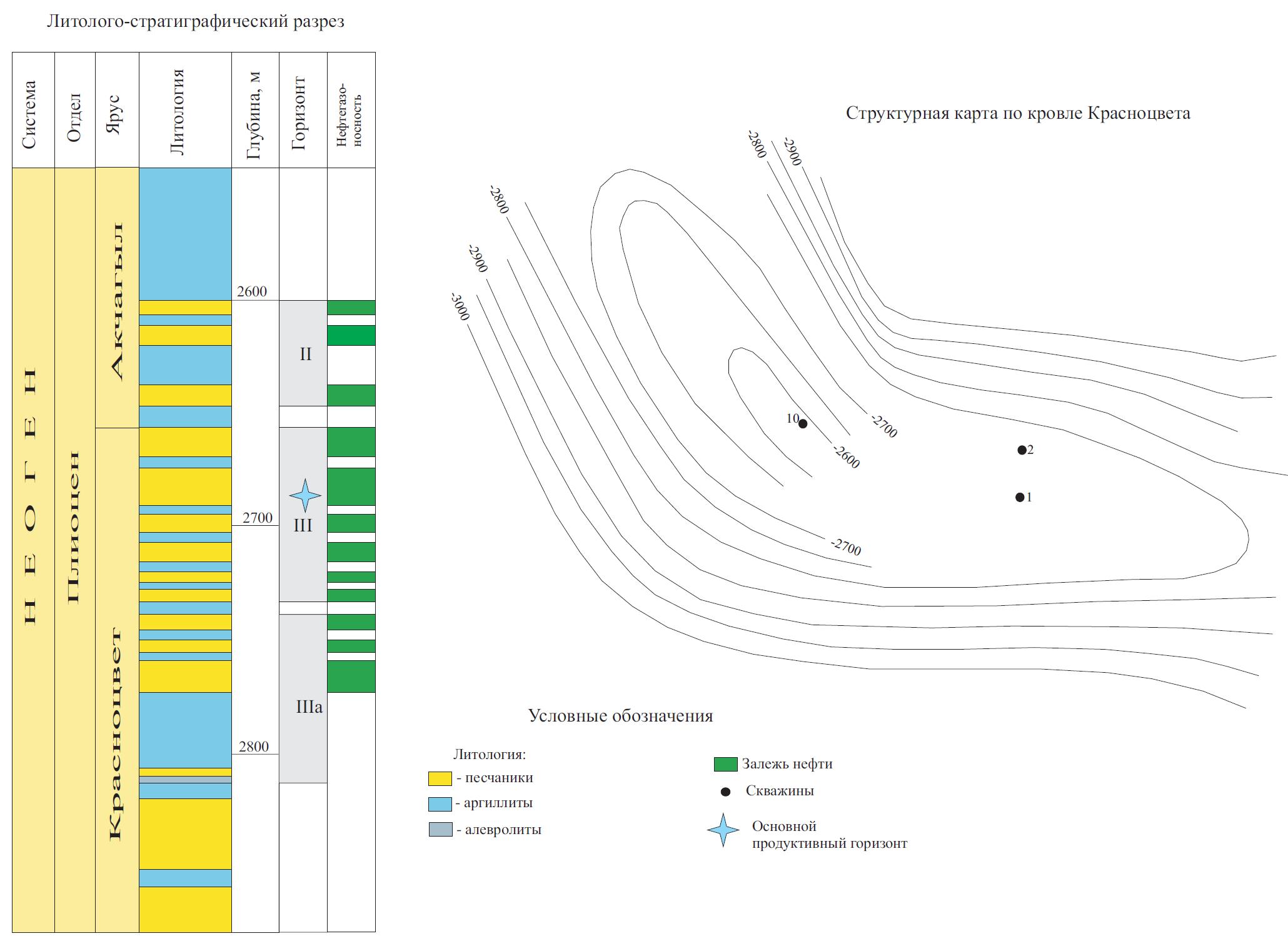 Горизонт II приурочен к нижней части акчагыльских отложений и представлен чередованием песков, алевролитов и глин, проницаемость горизонта 0,045 мкм2.