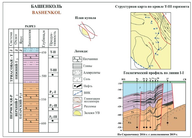 В толще верхней перми разведаны три (Р 2 -I, Р 2-II и Р 2-III) нефтяных тектонически экранированных горизонта. При этом Р 2-III горизонт экранируется крутым уступом соляного ядра. Эффективные нефтенасыщенные толщины составляют 5-7 м. Начальная пластовая температура 23°С. Дебиты нефти достигали 45 м3/сут на 10 мм штуцере. Дебиты попутного газа достигали 60,27 тыс. м3/сут.