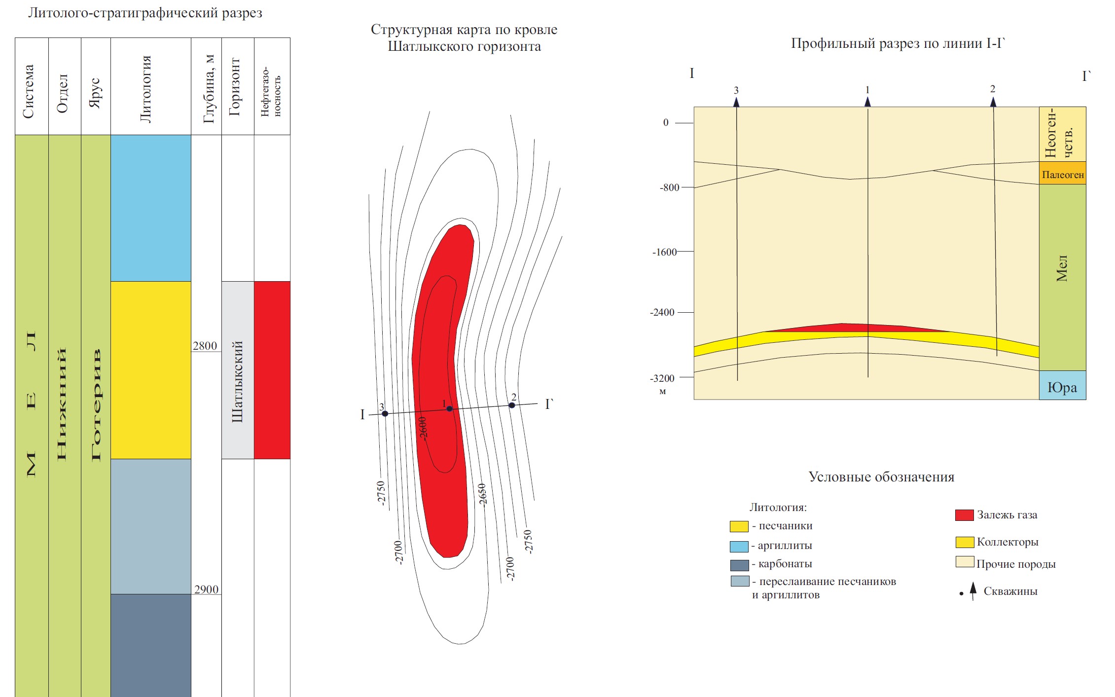 Газовая залежь содержится в шатлыкских песчаниках, местами глинистых, слабо известковистых. Средняя открытая пористость продуктивного горизонта – 19%, средняя проницаемость – 0,0268 мкм2. Мощность горизонта колеблется от 60 до 70 м. Залежь пластовая сводовая, размеры 20х2,5 км. Начальные запасы газа – 27,9 млрд. м3.