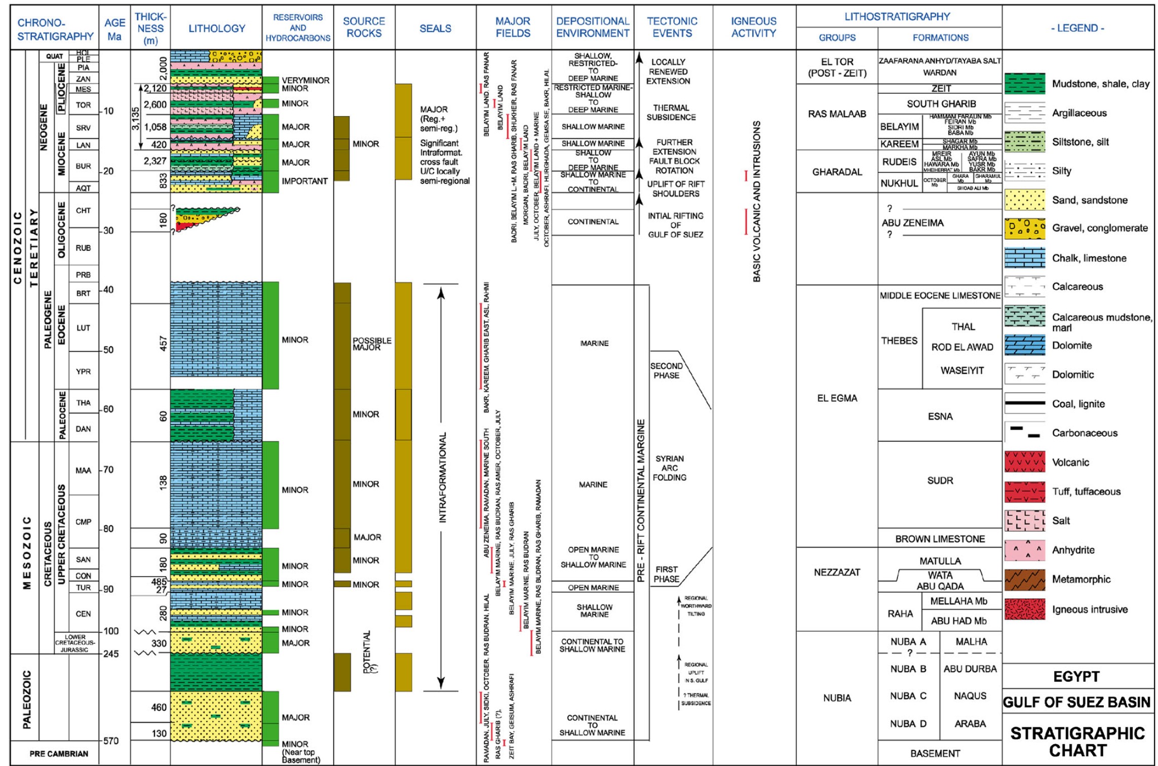 Thermal subsidence time is 11.4–10.7 Ma according to (IHS 2006) (Fig. 1). Post-Belayim deposition consists of two further evaporitic units, the South Gharib Formation (dominantly halite) and the Zeit Formation (interbedded anhydrites and clastics, with minor halite). These evaporites are the key sealing facies in the basin (Fig. 1) (IHS 2006). By 5 Ma, Aqaba-Dead Sea transform fault replaced the Gulf of Suez as the primary plate boundary between the African and Arabian plates (Evans 1990). The period 5.2–0 Ma is characterized by subsidence driven dominantly by cooling following active rifting, but with an overprint of locally renewed extensional faulting in the south of the basin from 5.2 to 4 Ma. The main structures include half-grabens, drape structures, and modification of existing block traps through the rejuvenation of bounding faults (IHS 2006). A pronounced unconformity is recognized at the top of the Zeit Formation, before renewed subsidence and accumulation of Plio-Pleistocene clastics commenced. This renewed subsidence appears to reflect the resumption of extension and sea floor spreading in the south of the Red Sea Rift System. Although the bulk of the extension in the Red Sea appears to have been accommodated by movements on the Dead Sea-Gulf of Aqaba transform, there is evidence for renewed extension in both the north and south of the Gulf of Suez, from about 5 Ma to present. In the south, a number of faults cut the seabed and earthquake data shows there is active faulting at the present. In the north, the very large thicknesses of Zeit Formation and post-Zeit sediments (EL-Tor Group) adjacent to the Darag Fault, following negligible deposition of South Gharib sediments, points to renewed extension (Fig. 1) (IHS 2006).