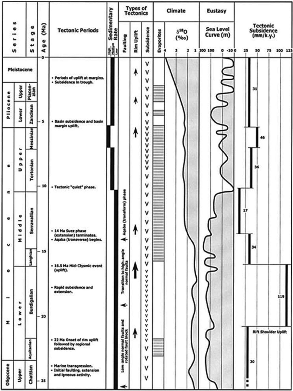 Fig. 2 The relationship between tectonic subsidence rates, types, periods, climate, and sea level changes during the Neogene in the Gulf of Suez (compiled and modified from (Bosworth et al. 1998; Griffin 1999). Smaller V symbols represent periods of rapid basin subsidence, for example, the Burdigalian; larger V symbols represent modest rates of basin subsidence, for example, in the Serravallian