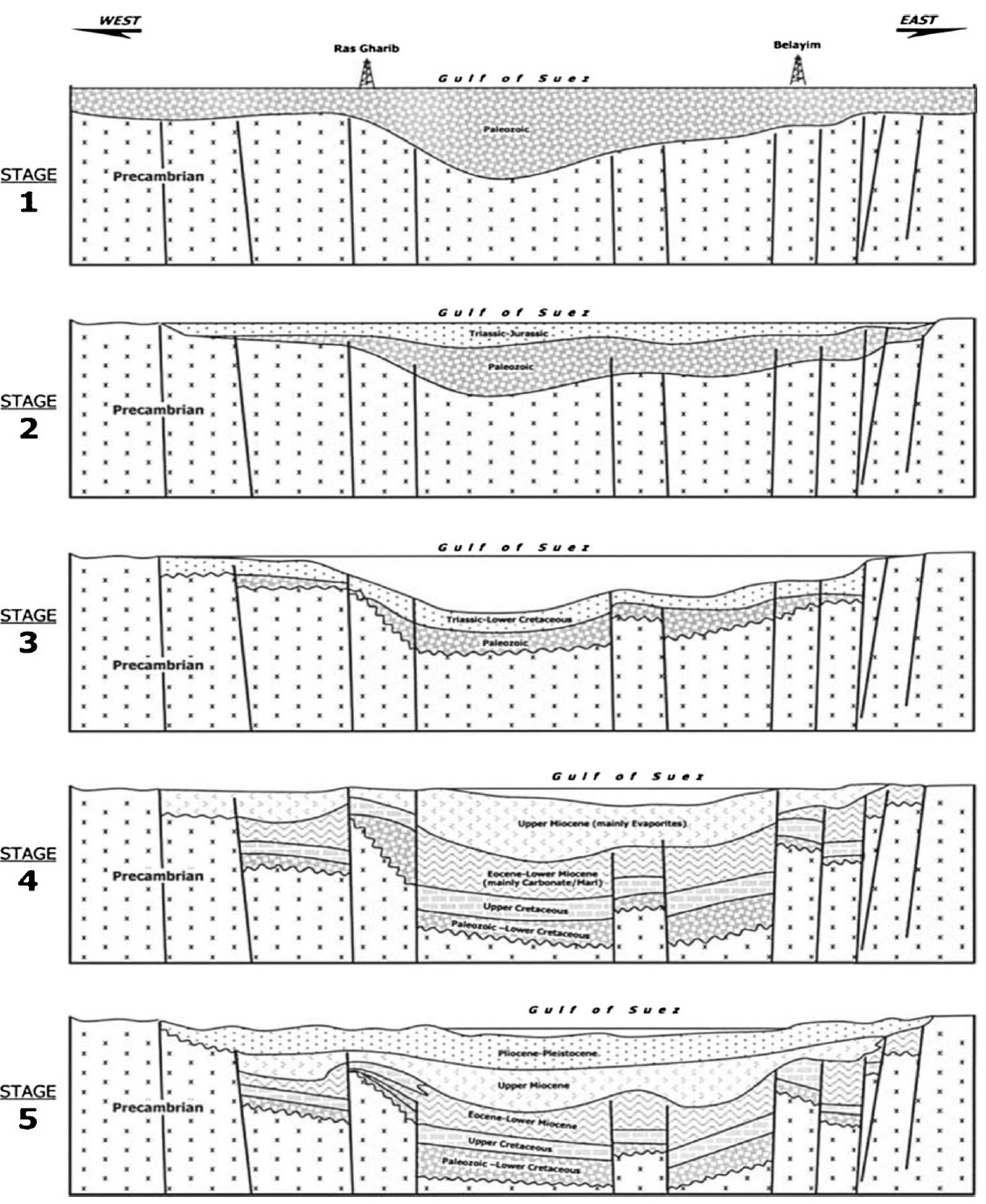 The evolution of the Gulf of Suez basin is in stages from the Paleozoic to the Holocene and is characterized by tectonic extensional episodes producing tension block faulting (horst and graben) and block subsidence (Fig. 3) (see also (Kingston et al. 1983)). The Gulf of Suez has developed in a series of distinct evolutionary stages as shown in Fig. 3.