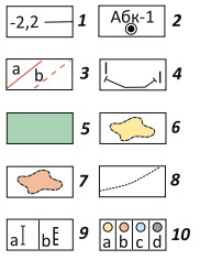 1 — изогипсы; км; 2 — скважина и ее номер; 3 — разрывные нарушения: а — в кровле тэтэрской свиты, b — в нижележащих горизонтах; 4 — линия геологического разреза; 5 — интрузия; месторождения (6, 7): 6 — газовые, 7 — газоконденсатные; 8 — условный газоводяной контакт; 9 — тип испытания: а — в открытом стволе, b — в колонне; 10 — насыщение пласта: а — газом, b — газоконденсатом, c — водой, d — приток не получен