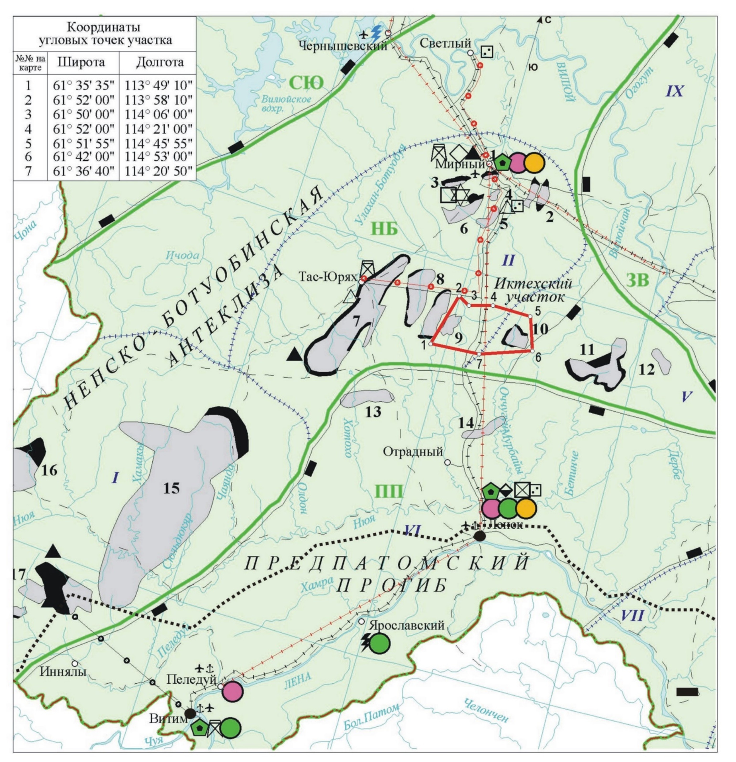 В тектоническом плане Иктехский ЛУ расположен в зоне сочленения Вилючанской седловины с Мирнинским выступом Непско-Ботуобинской антеклизы.