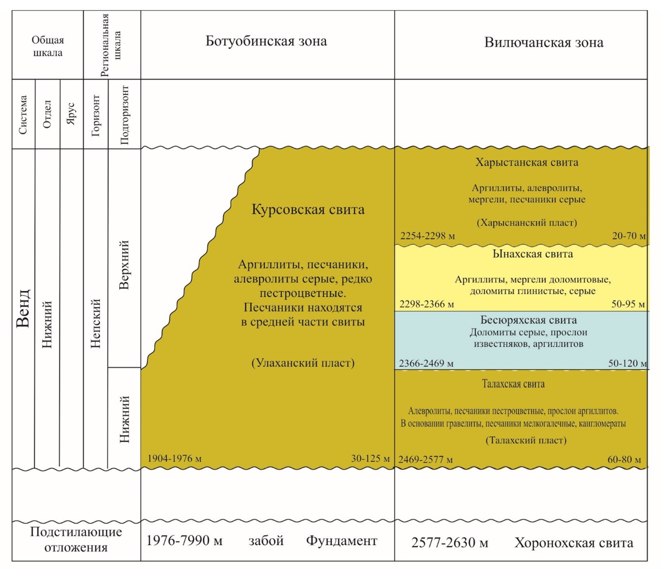 На Бесюряхском ГМ в отложениях венда выделяются снизу вверх: курсовская, бюкская, успунская и кудулахская свиты.