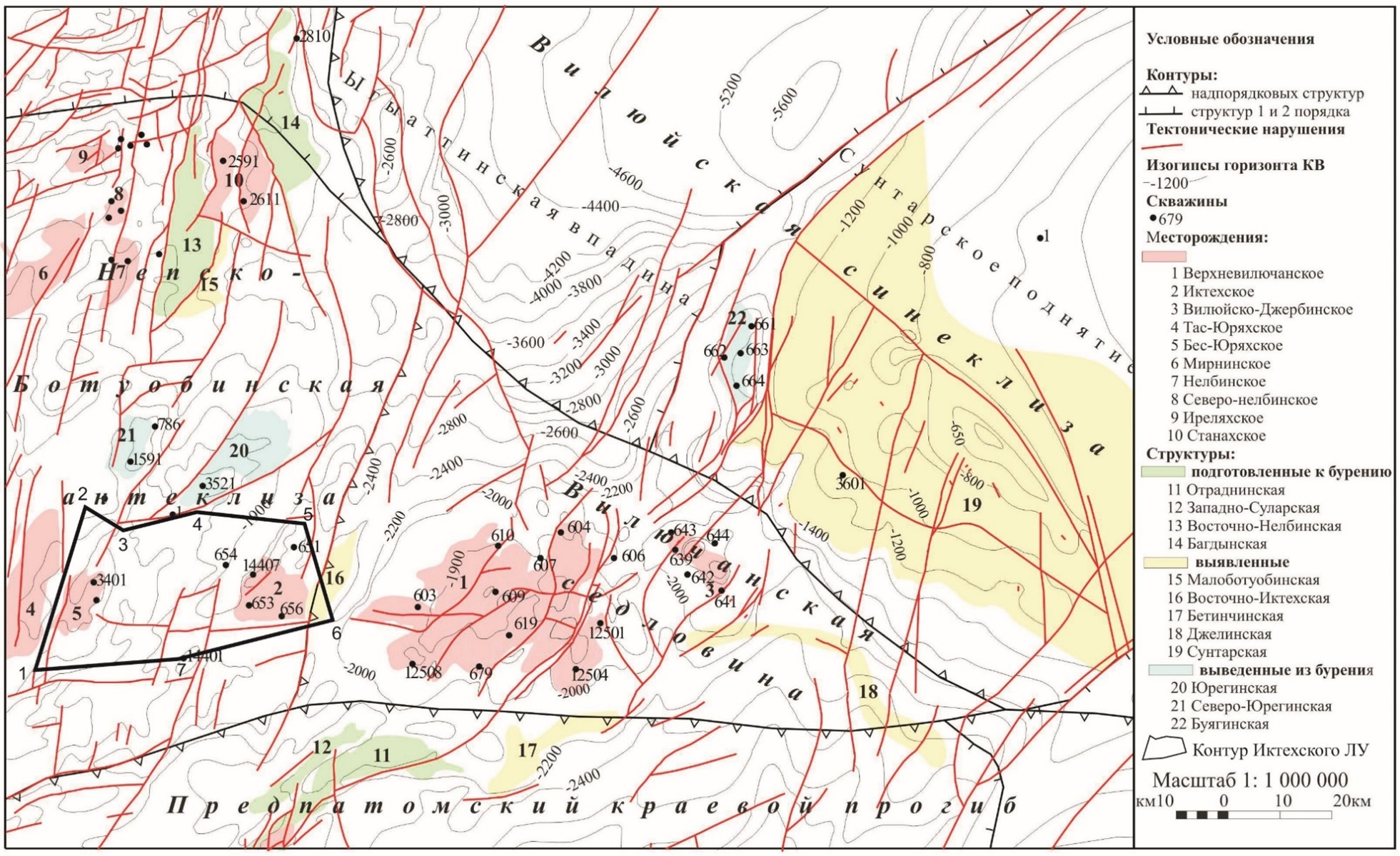 Рис.3. Фрагмент структурно-тектонической схемы Республики Саха (Якутия) по материалам отчёта “Подсчёт запасов газа, конденсата и нефти Верхневилючанского месторождения” Матвеев В.Д. и др, 2003 г.