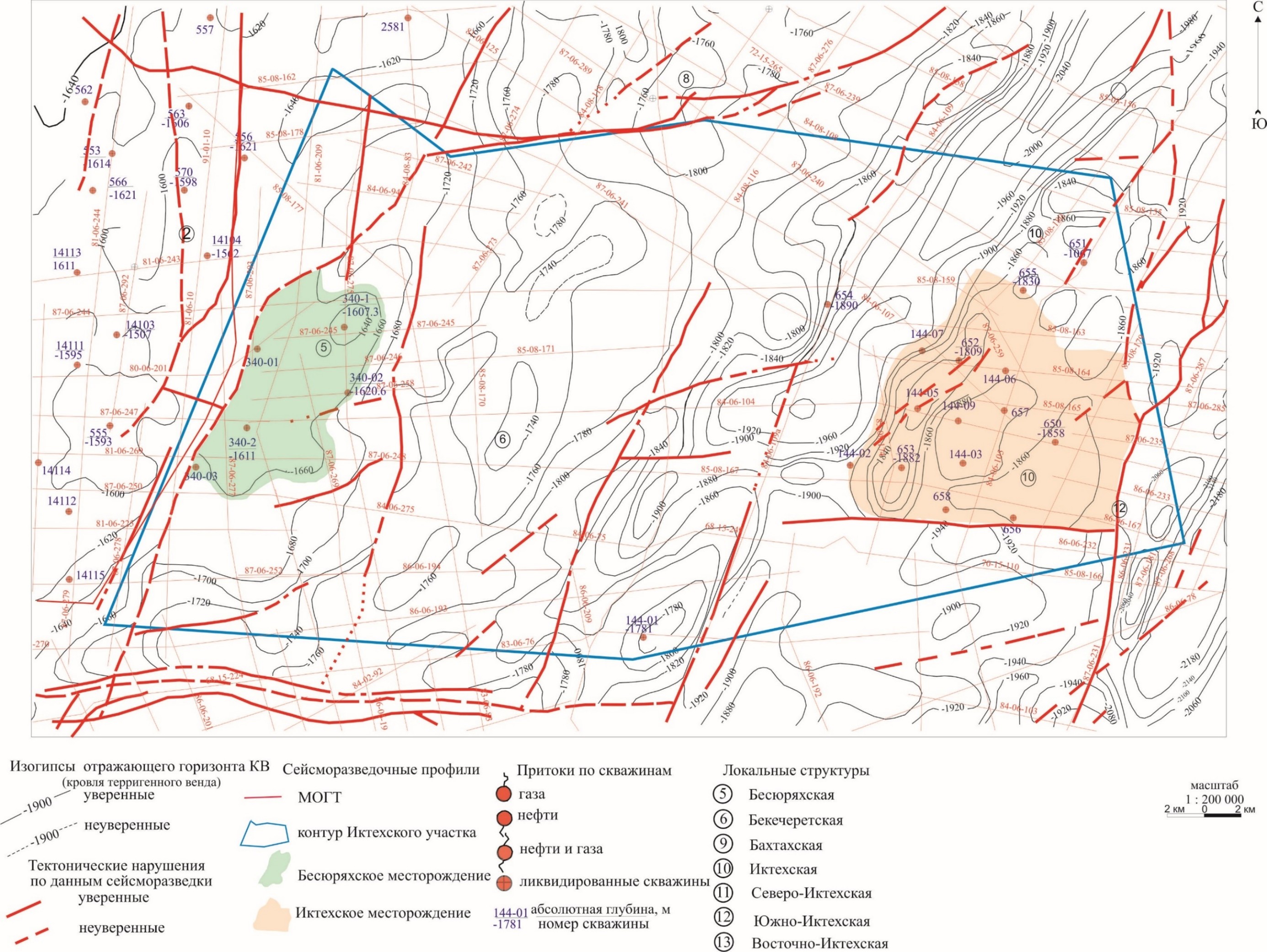 Структурная карта по отражающему горизонту Ф, характеризует структурный план поверхности кристаллического фундамента. Абсолютные глубины залегания кровли образований фундамента в пределах отчетной площади изменяются от -1620 м до -2260 м, относительный перепад отметок составляет 640 м. Площадь подразделяется на серию блоков. Западная часть площади приподнята относительно ее восточной части, границами служат зоны тектонических нарушений юго-восточного простирания, проходящие почти через всю территорию площади. В восточной части территории расположено Иктехское поднятие.