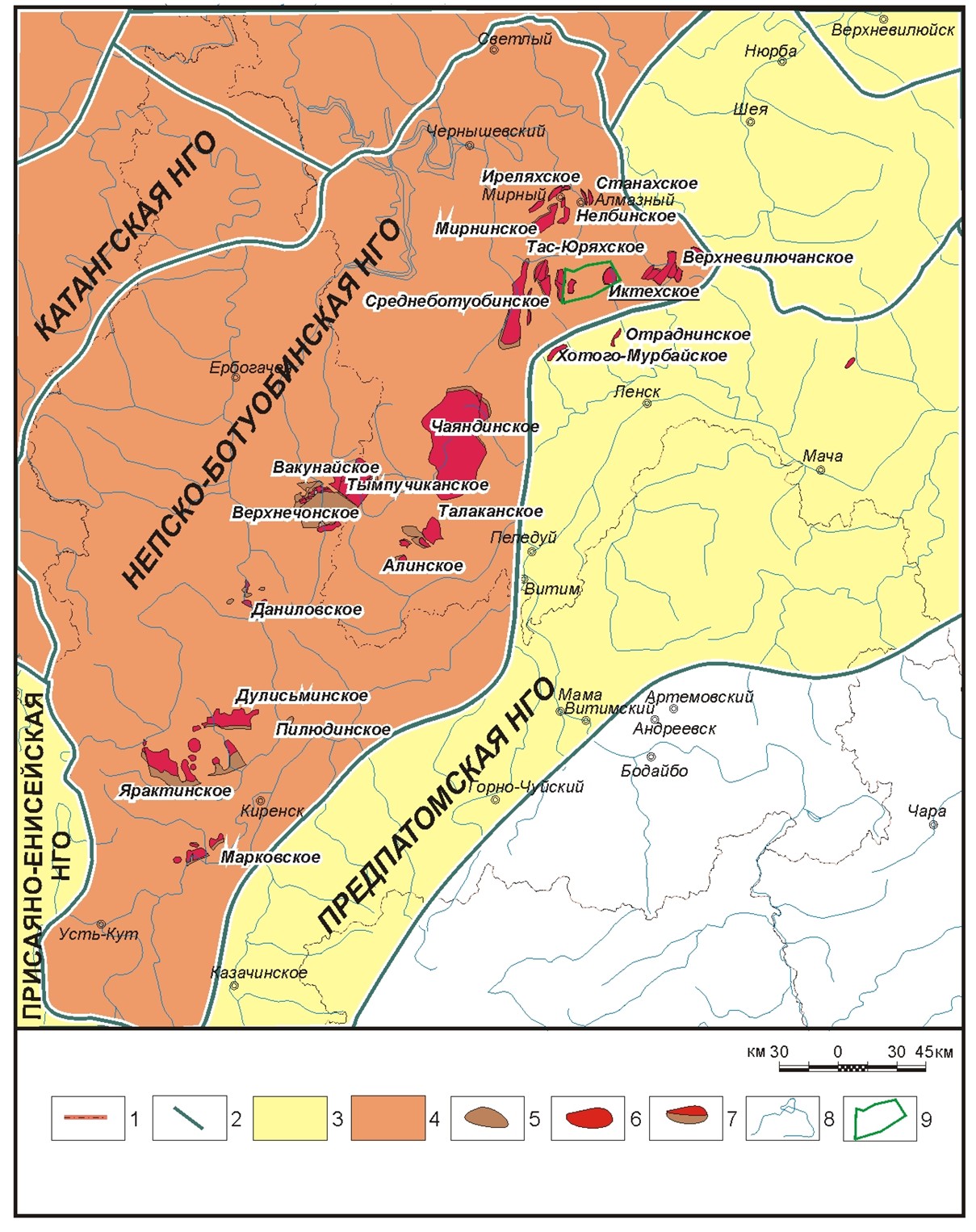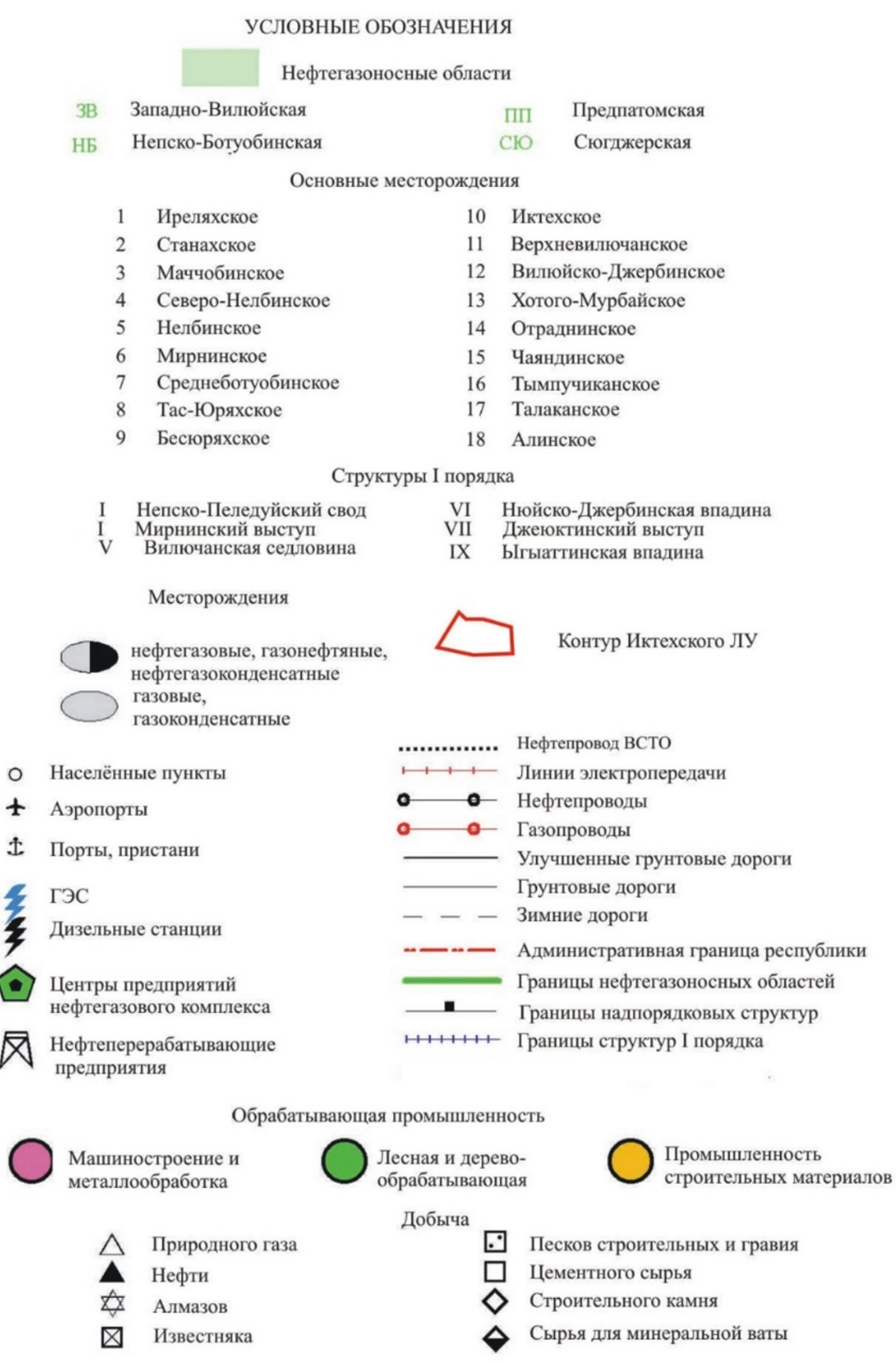 Условные обозначения: границы: 1 - административные, 2 - тектонических элементов; нефтегазоносные области: 3 - преимущественно с газовым составом залежей УВ, 4 - преимущественно с газонефтяным составом залежей УВ; месторождения: 5 - нефтяные, 6 - газоконденсатные, 7 - газонефтяные, нефтегазовые и газонефтеконденсатные; 8 - гидрографическая сеть; 9 – Иктехский л. у.