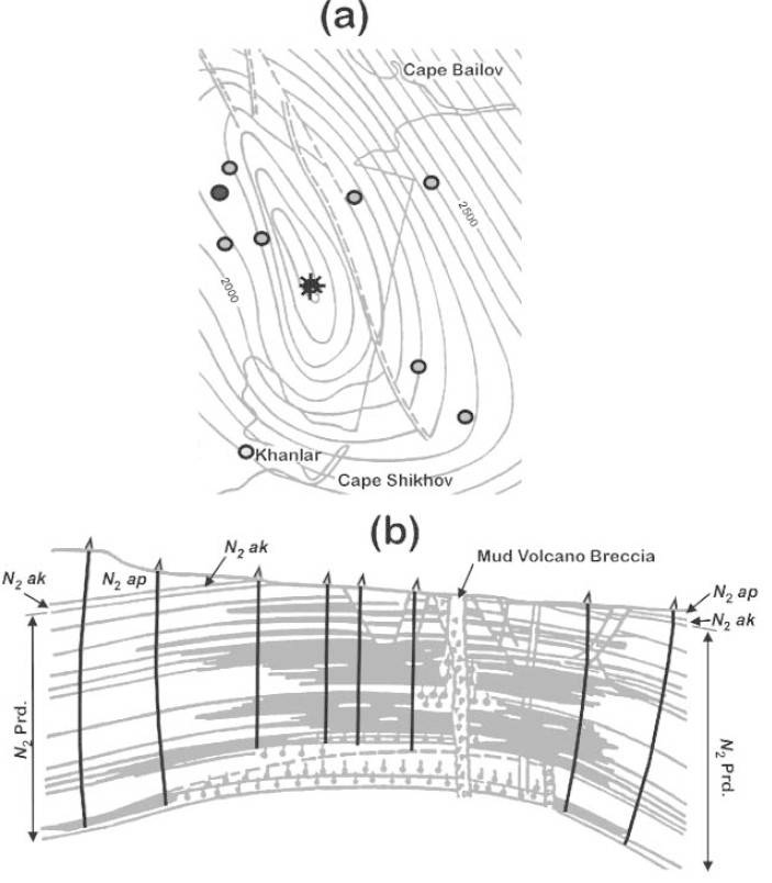 В этом районе представлены плиоцен-четвертичные отложения. Отложения образуют асимметричную складку с крутым западным (до 50°) и пологим восточным (15–27°) крыльями. Антиклиналь разбита многочисленными поперечными разломами, а ее гребень пронизан грязевым вулканом (рис. 1).