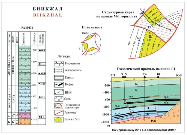 Нефтяное месторождение Биикжал находится на востоке Южно-Эмбинской нефтегазоносной области, расположено рядом с месторождением Мунайлы. В структурном отношении месторождение приурочено к четырехкрылому соляному куполу. Продуктивными являются три западных крыла. На северо-западном крыле установлена продуктивность юрских (один горизонт) и меловых (четыре горизонта) отложений. На западном и южном крыльях выявлено по одному триасовому горизонту.
