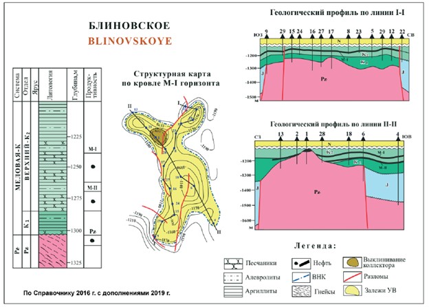 В структурном отношении месторождение приурочено к малоамплитудным поднятиям в меловых отложениях, облекающих палеозойский выступ фундамента. В плане эти поднятия образуют сложной конфигурации приподнятую зону, имеющую размеры 7,5 х3,0 км. На месторождении разведаны 2 нефтяные горизонты (M-I и M-II) в меловом комплексе пород и один горизонт (PZ) в палеозойских отложениях.