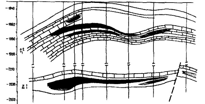 В пашийском горизонте (Дl) 4 залежи различных размеров. Залежи пластово-сводовые, частично тектонически и литологически ограниченные. ВНК -2236 м. Мощность 1,1-3,3 м, пористость 15-16%, проницаемость 0,18 мкм2.