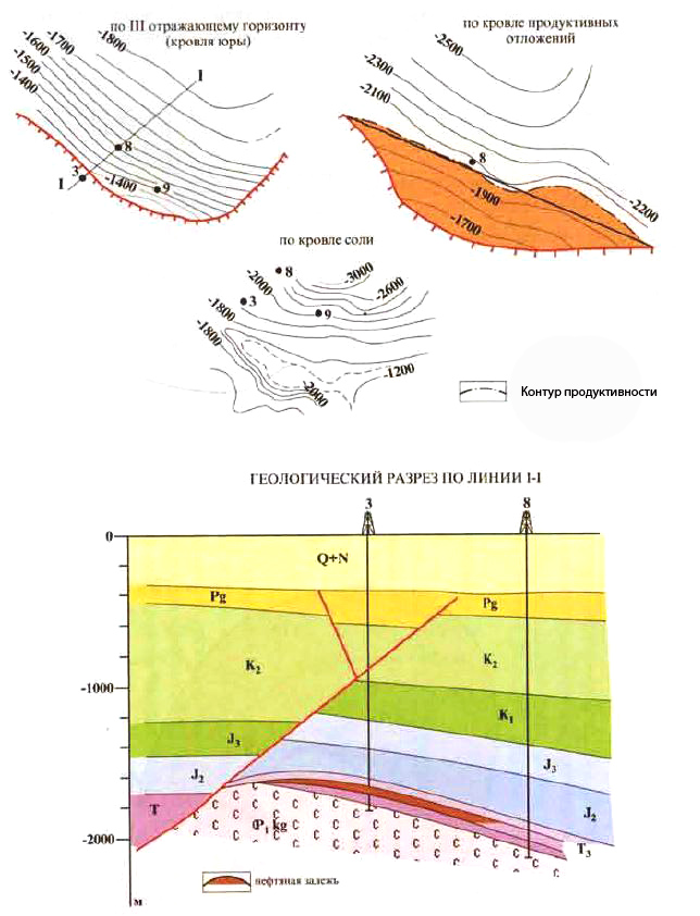 В структурном отношении оно контролируется небольшим трехкрылым соляным куполом с глубоким залеганием соляного ядра (около 1600 м). На северо-восточном крыле купола прямо над соляным телом на глубине 1828 м выявлена нефтяная залежь.