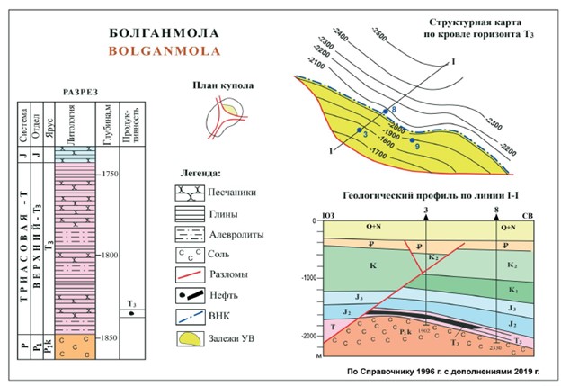 Месторождение выявлено в 1964 г. Структура Болганмола (рис. 1) представляет собой полусводовое поднятие, экранированное по восстанию и латерали примыканием к соляному ядру. Залежь пластовая, литологически ограниченная. Продуктивные отложения вскрыты на глубине 1828 м.