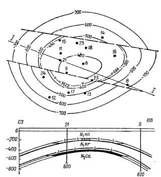 Рис 1. Структурная карта Борзовского газонефтяного месторождения по кровле продуктивного горизонта в чокракских отложениях и геологический разрез по линии I-I (составили В. М. Костив и И. В. Леськив). 1 - изогипсы; 2 — разрывные нарушения; 3 — линия геологического разреза; 4 — границы стратиграфических подразделений в условиях согласного (а) и несогласного (б) залегания; 5 — граница размыва продуктивного горизонта; контуры: 6 — нефтяной залежи, 7 — газовой залежи; 8 — граница замещения коллектора неколлектором (штрихи в сторону отсутствия коллектора); 9— условная граница продуктивности; 10 — нефть; 11 - газ; 12 — сейсмические условные отражающие горизонты.