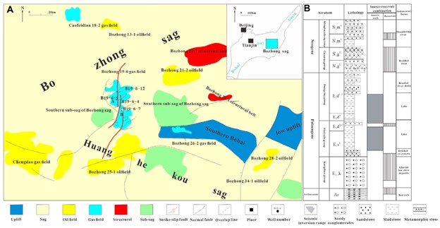 Fig.1 (A) Regional location of the BZ19-6 condensate gas field; (B) Comprehensive stratigraphic column of the BZ19–6 condensate gas field.