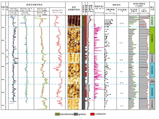 Shear fractures are mainly developed, and the fracture surface is relatively straight. The fracture aperture is between 2 and 7 mm and the fracture length is between 1 and 10 mm. The fracture filling degree is high, and the fractures are mainly filled with clay and carbonate minerals. Fractures mostly cut through quartz, feldspar and other mineral particles, and are accompanied by dissolution, pores enlarged by dissolution are developed along microfractures. In addition, the network fracture system intersected by fractures can also be observed, it is significant for improving the storage and permeability properties of metamorphic rock reservoirs.
