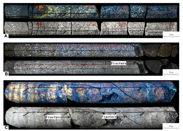 Fig. 4 (A) Well BZ19-6-C, 4538.05–4538.90 m, exhibits numerous shear and tensile fractures with significant variations in orientations. The distribution forms a mesh-like intersection pattern, with many fractures being partly or completely filled. (B) Well BZ19-6-I, 4429.00–4429.90 m, displays a highangle shear fracture and a weathered and dissolved fractured zone in the lower part. (C) Well BZ19-6-C, 4678.06–4678.59 m, shows multiple shear and tensile fractures. The filling minerals within the fractures have undergone dissolution.