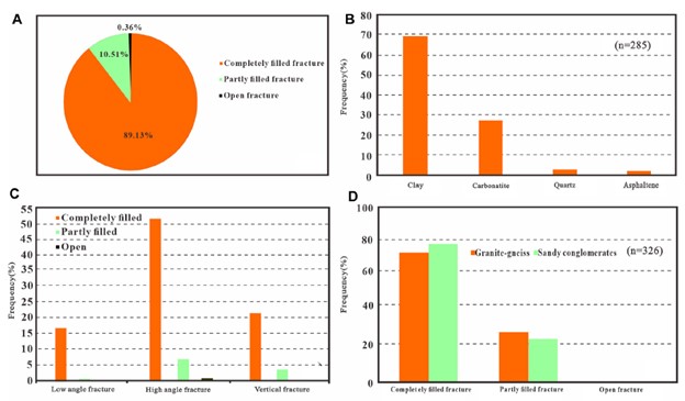Fig. 5 A) Types of structural fracture filling; (B) Types of materials filling tectonic fractures; (C) Filling degree of tectonic fractures at different angles; (D)The Filling degree in tectonic fractures for different lithologies