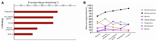 Fig. 6 (A) Connection about density and lithology of structural fracture; (B) Distribution of mineral content in diverse lithologies.