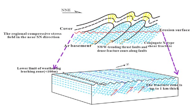 At the same time, the N-E oriented thrust extrusion caused the study area to uplift sharply, forming an anticline uplift structure. The Archean metamorphic rock basement exposed the surface to weathering and leaching, and atmospheric water leached along the fault to the interior of the buried hill, forming a thick weathering crust. Due to the early formation time, these fractures experienced strong diagenesis in the later deep burial process, and most of the fractures were filled (Tong et al., 2012).