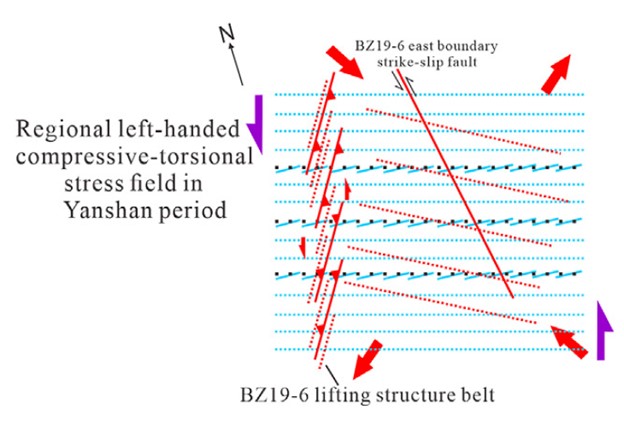 In general, The formation of buried hill reservoir fractures in the study area has experienced the initial formation of buried hill caused by strong extrusion in Indosinian period, the superimposed transformation and destruction of compression-torsion strike-slip in early Yanshanian period, the reformation of fault depression into mountains in middle Yanshanian period, and the multi-stage structural transformation and superimposed transformation process of reactivation of tension-torsion extension fractures in Himalayan period. The strong compressional tectonism in Indosinian period laid the reservoir foundation of buried hill, the sinistral strike slip in Yanshanian period further expanded the scale of fractures, and the dextral strike slip in Himalayan period reactivated the early fractures and formed a super large scale fractures system.