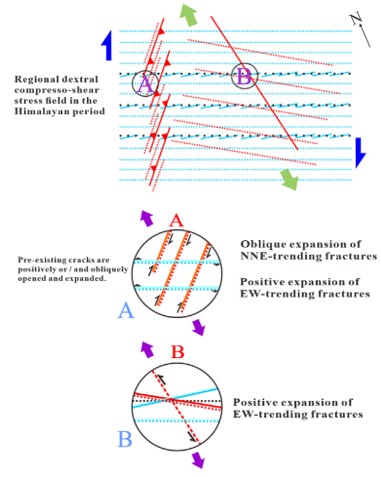 The Himalayan period is the main period for the formation of effective fractures in the reservoir of the study area. Although the ability of the Himalayan period to development new fractures is not as good as that of the Indosinian and Yanshanian periods, the Himalayan tectonic movement can re-activate the early fractures (Wang et al., 2018)(Figures 7C,D).