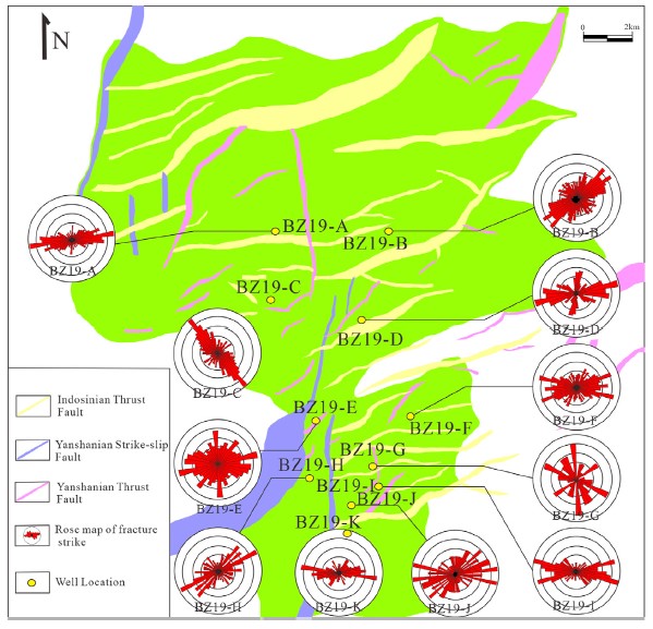 Fig. 8 Major larger fault distribution map, modified from (Dai et al., 2021), the fracture orientations are obtained from the data of 11 wells.